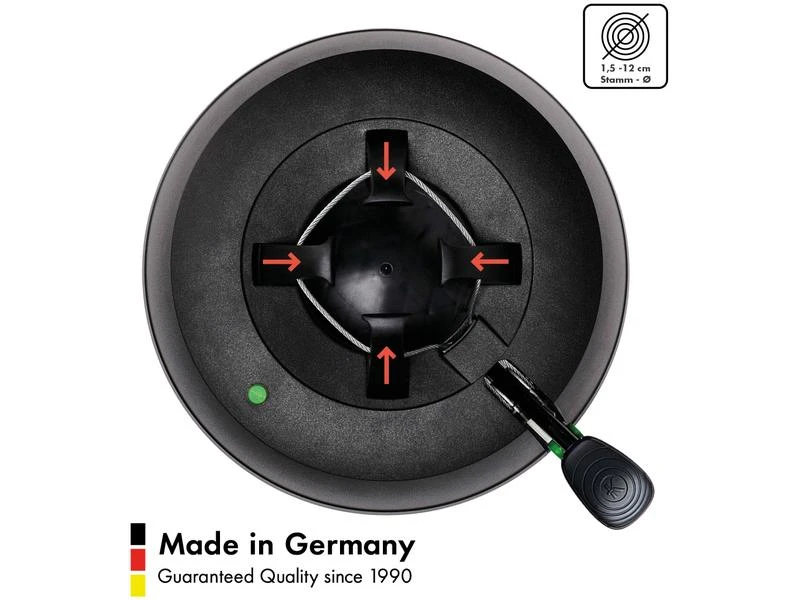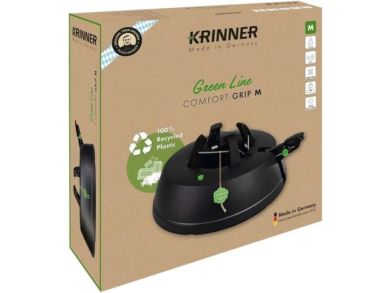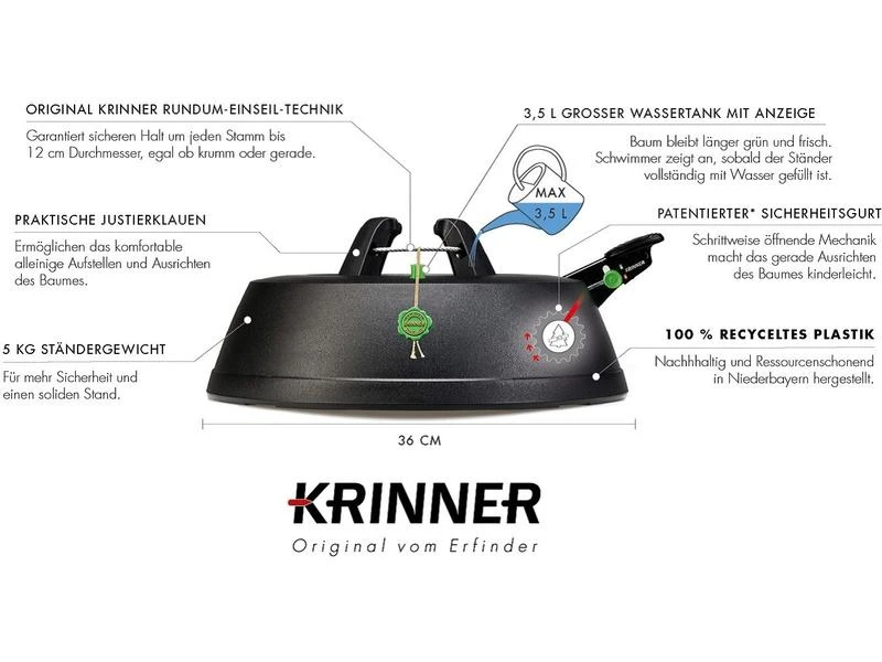 Der neue Christbaumständer KRINNER Green Line Comfort Grip M wird nachhaltig und ressourcenschonend aus 100% recyceltem Kunststoff in Niederbayern hergestellt und trägt damit aktiv zum verantwortungsvollen Umgang mit unserer Umwelt bei. Das neue Pedal besticht sofort durch seine deutlich grössere Auflagefläche und sorgt damit für optimalen Halt Ihrer Fuss-/Schuhsohle bei Betätigung des Fusspedals. Die durchgehende Seilführung der original Rundum-Einseil-Technik garantiert dabei den gleichmässigen Druck der Klauen an den Stamm. Einfach den Baum in den Ständer stellen, das Fusspedal treten, fertig! Ob dick, dünn oder krumm gewachsen, der Baum steht sicher und kerzengerade. Zudem sorgt der patentierte Sicherheitsgurt durch seine schrittweise öffnende Mechanik für extra Sicherheit und verhindert ungewolltes Kippen