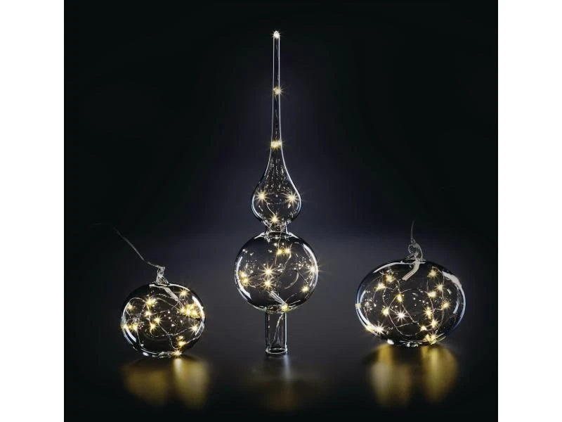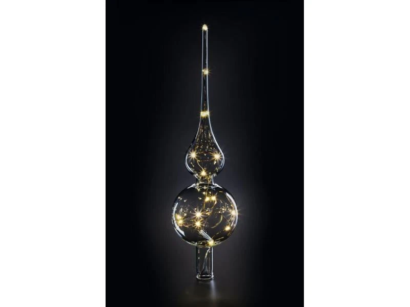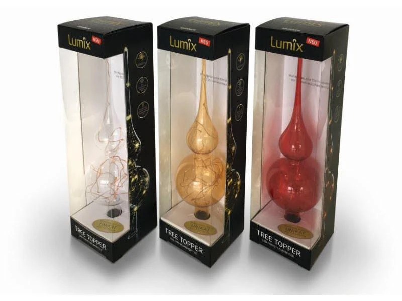Der Lumix Tree Topper ist der krönende Abschluss für Ihren Weihnachtsbaum. Eine traditionell in Thüringen mundgeblasene Christbaumspitze, ausgestattet mit 15 hell und warmweiss leuchtenden LED’s. Um den individuellen Dekorationswünschen der Kunden zu begegnen, wird es die Lumix Tree Topper in drei Farbvarianten geben: Klar, Gold und Rot. In Kombination mit der Lumix Infrarot-Fernbedienung wird sogar der Lumix Superlight-Modus nutzbar. Das strahlende Highlight für Ihren Baum!