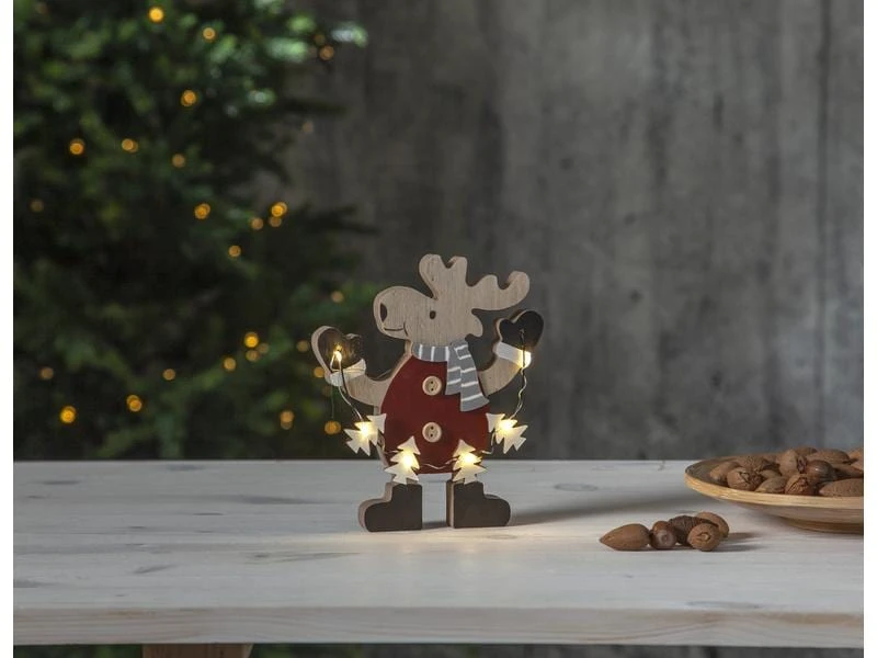 Fröhliches Reh, das eine kleine Lichtschleife hält. Dekorieren Sie das Kinderzimmer für Weihnachten und es leuchtet schön im Fenster und gibt eine gemütliche Weihnachtsatmosphäre.