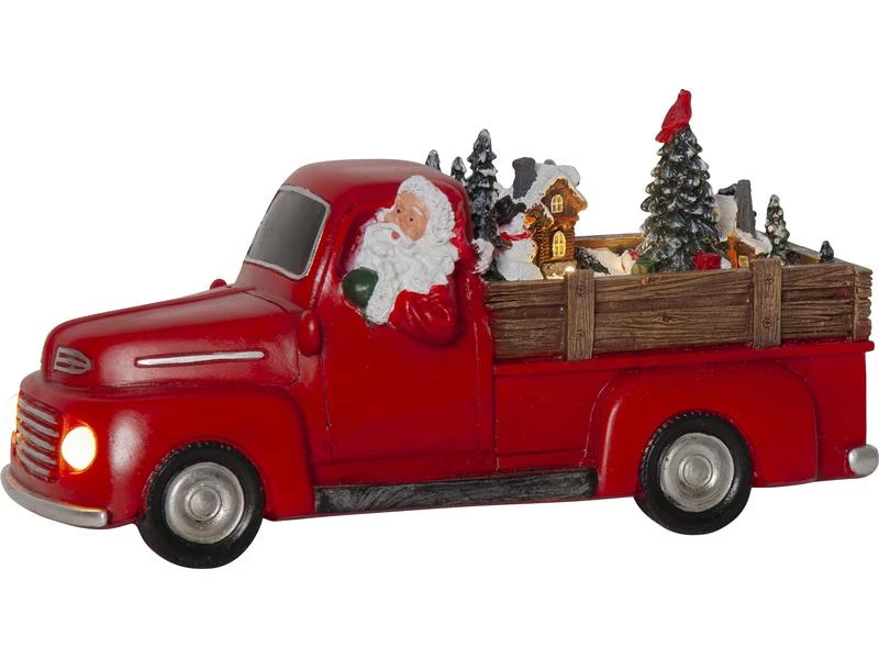 Eine schöne Weihnachtsdekoration, der Weihnachtsmann in seinem roten Lastwagen, beladen mit einer winterlichen Landschaft, die schön glänzt. Alles vermittelt ein gemütliches Weihnachtsgefühl. Der Weihnachtsbaum dreht sich und der Laternenrahmen auf dem Lastwagen leuchtet. Dekorieren Sie für Advent und Weihnachten, passt sowohl das Kinderzimmer und auf einem Regal.