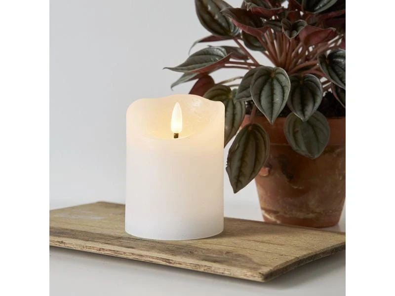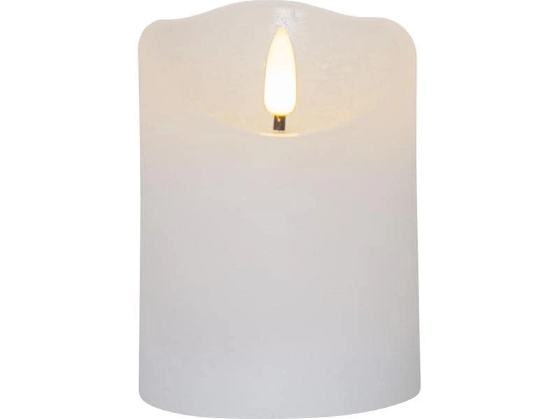 Weisse Wachskerze mit rustikaler Oberfläche aus der Serie Flamme. Die naturgetreue Flamme leuchtet in einem warmen weissen Schein. Mit eingebauter Zeitschaltuhr.
