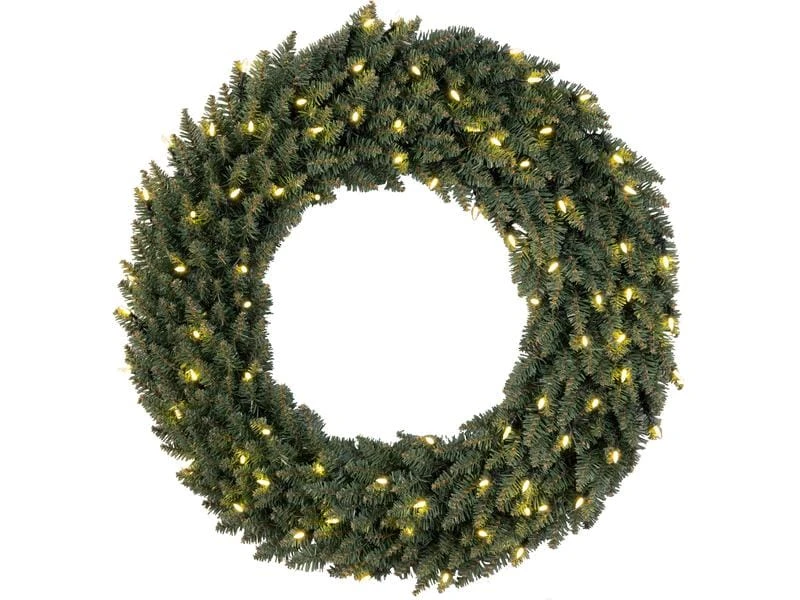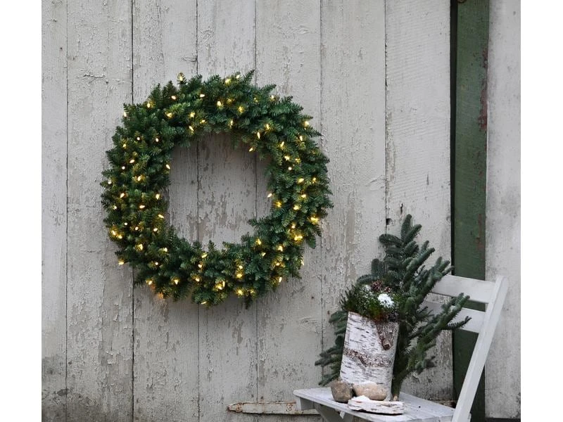 Grüner Kranz mit 80 LED-Lichtquellen mit warmweissem Glanz. Der Kranz gibt einen schönen und einladenden Glanz in der Dunkelheit. Dekorieren Sie mit dem Kranz im Innen- oder Aussenbereich, zum Beispiel an einer Tür.