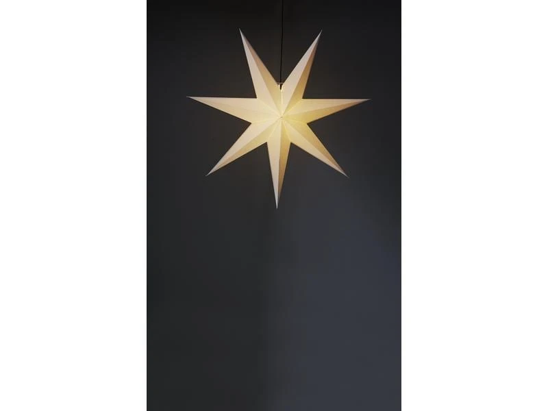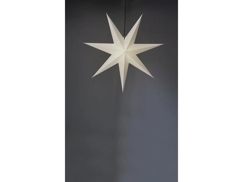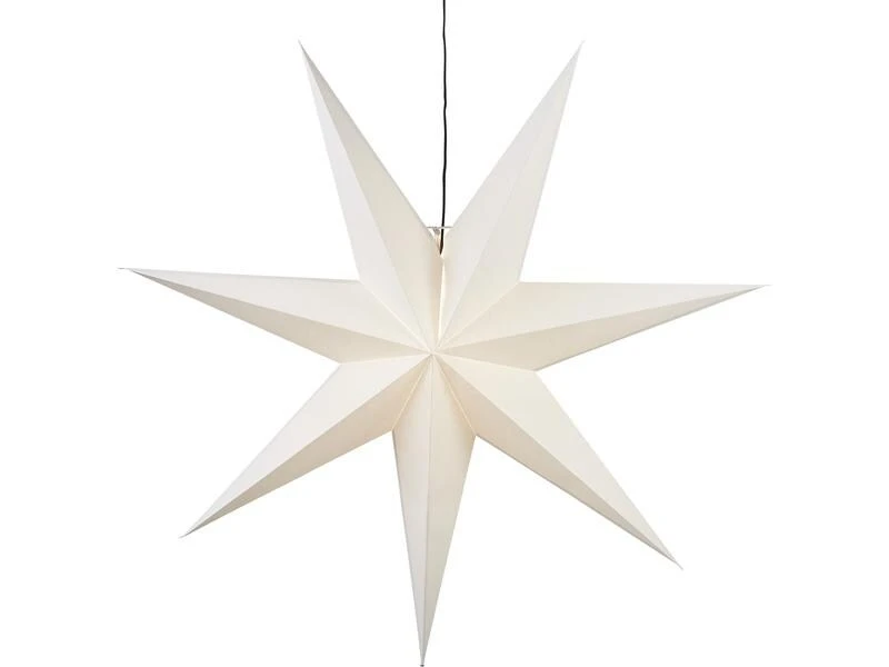 Weisser Papierstern mit schwarzem Textilkabel. Eleganter Stern zum Dekorieren im Haus. Der Stern hat Platz für eine Lichtquelle. Die Höhe beträgt 100 cm.