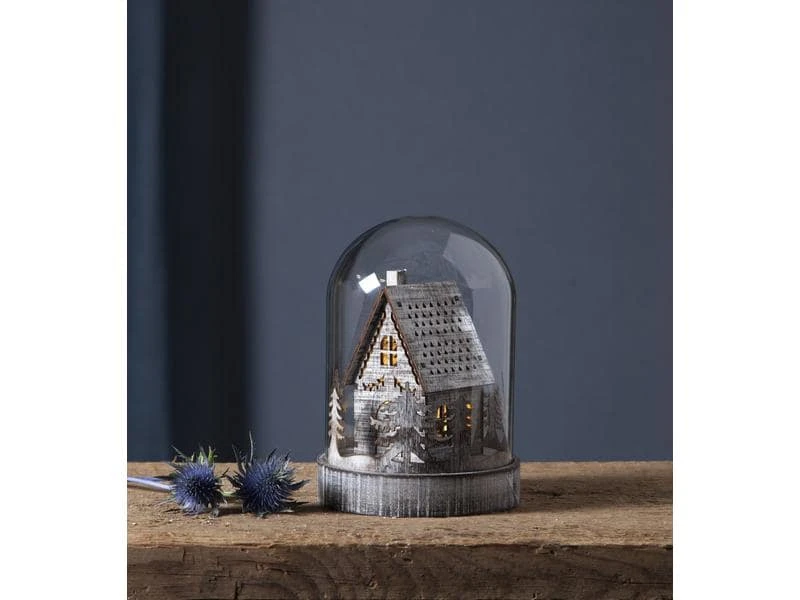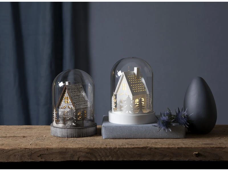 - Die Kuppel wird durch eine warmweisse, batteriebetriebene LED von innen beleuchtet