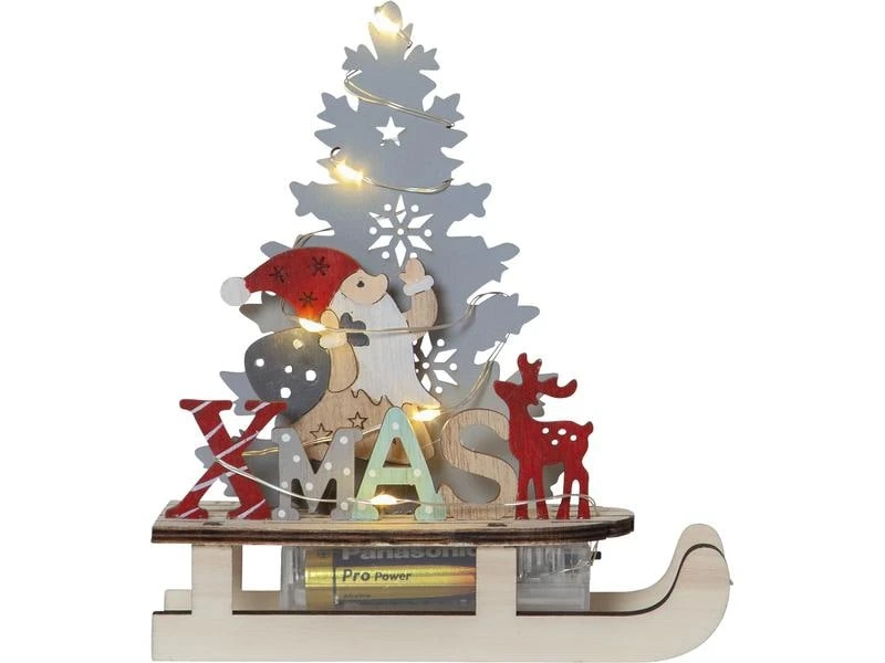 Dekoration mit lasergeschnittenen Details. Weihnachtsmann auf Schlitten für den Innenbereich. 5 LED-Lichter, die schön und stimmungsvoll leuchten. Auf einer Anrichte oder einem Regal platzieren für eine wunderbare Weihnachtsstimmung.