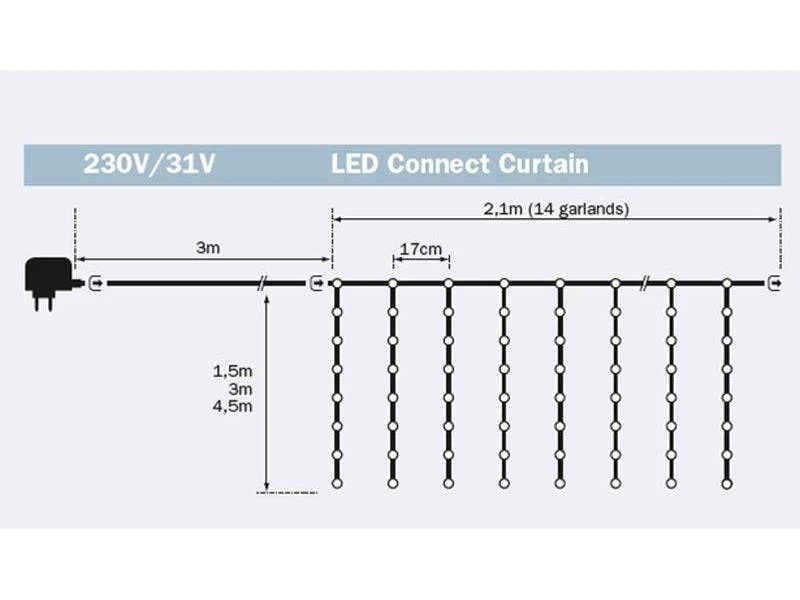 Der Connect Curtain 280 Lichtvorhang von OEM ist ein heller Vorhang, der mit 280 warmweissen LED-Lampen leuchtet. Er ist für die Anwendung im Outdoorbereich konzipiert und umfasst insgesammt 14 Stränge, welche in einem regelmässigen Abstand von 17 cm befestigt sind. Diese Stränge haben alle eine Länge von 3 Meter. Der Vorhang zeigt besonders im Winter seine Wirkung und bewirkt eine winterliche Atmosphäre. Die Anzahl LEDs lässt sich übrigens von 280 auf bis zu 1200 erweitern – für eine noch grössere Weihnachtsspielerei.