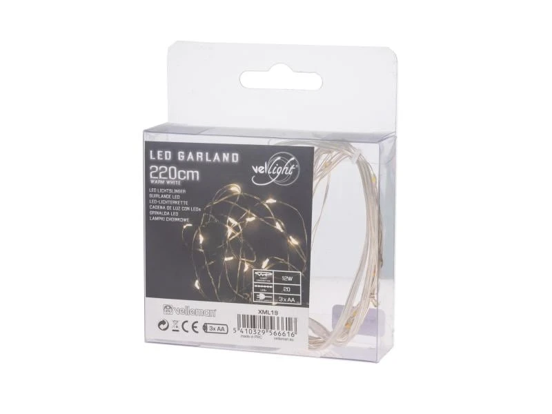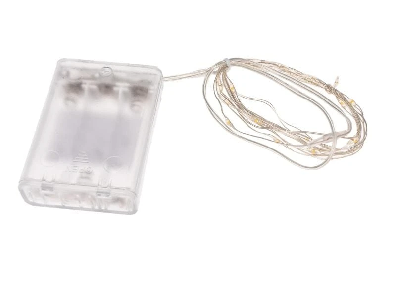 An dieser zwei Meter langen Lichterkette sind 20 gleichmässig verteilte LED-Lichter gekoppelt, die ein angenehm warmweisses Licht abstrahlen. Trotz der Länge ist die Kette lediglich 100 Gramm schwer und kann auch an schwer zugänglichen Orten problemlos angebracht werden. Wichtig zu beachten ist die Nichteignung für Orte unter freiem Himmel. Zum Betrieb werden drei 1,5-Volt-AA-Batterien benötigt. Die LED-Technik ermöglicht einen äusserst stromsparenden Betrieb, wodurch die Batterien lange halten.